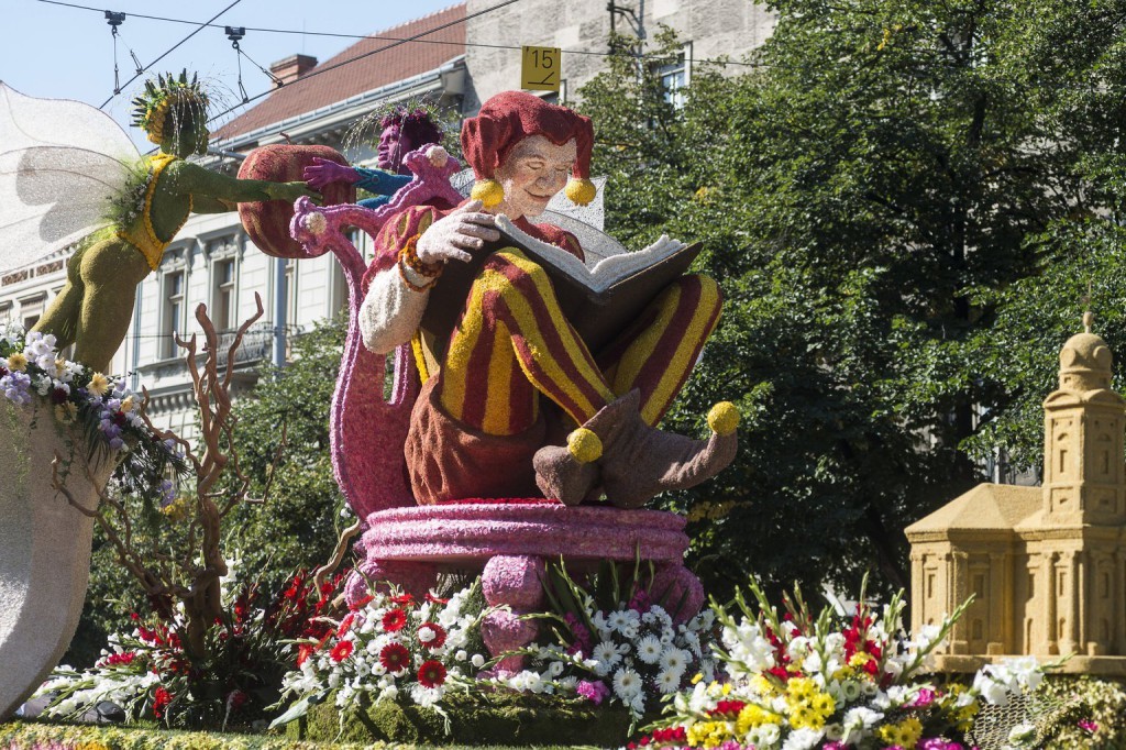 Kompozíció a 47. alkalommal megrendezett debreceni virágkarneválon 2016. augusztus 20-án. A felvonuló 16 virágkocsit összesen kétmillió szál virággal díszítették. - MTI Fotó: Balázs Attila