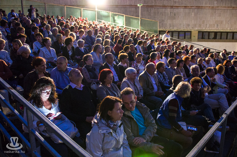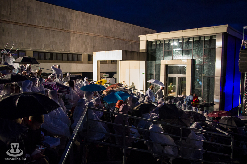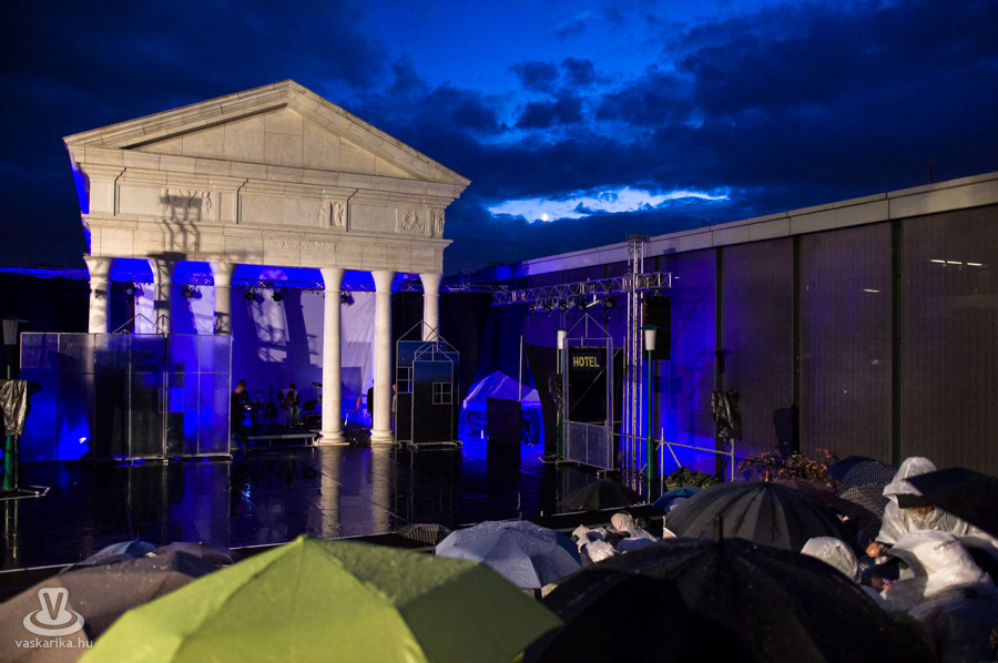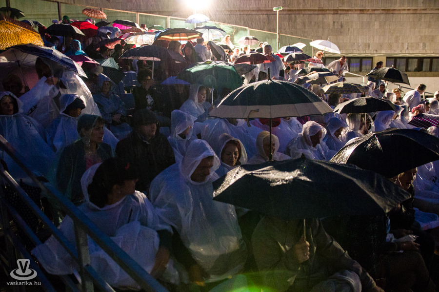 20 percet eleve csúszott a kezdés, ami egyrészt a kissé kései beengedésnek, másrészt a kényelmes közönségnek köszönhető, hiszen volt, aki 21:15-kor foglalta el helyét. Pereccel, naná, ahogy kultúrprogramra kell jönni... Aki nem előre, hanem felfele nézett, az persze láthatta (az okostelefonos radarjelentésekből meg biztosra is vehette....), hogy itt nem Ezüst eső lesz, hanem "sima". A zenekar első taktusai után meg is eredtek az égi csatornák, előkerültek az esernyők, esőkabátok és a kis fehér "ajándékkotonok", amik egyre nagyobb összefüggő területén jelentek meg a nézőtérnek, mintha egy white partyn lennénk.