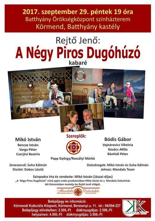 De, térjünk vissza a péntek programjára, mert nem "A ponyvafejedelem" lesz az egyetlen, ami emléket állít a legendás regényírónak ezen a napon: "A négy piros dugóhúzó" című kabaré 19 órakor kezdődik a Batthyány-kastély színháztermében, a főbb szerepekben Mikó Istvánnal és Bódis Gáborral, előbbi rendezőként is jegyzi a darabot.