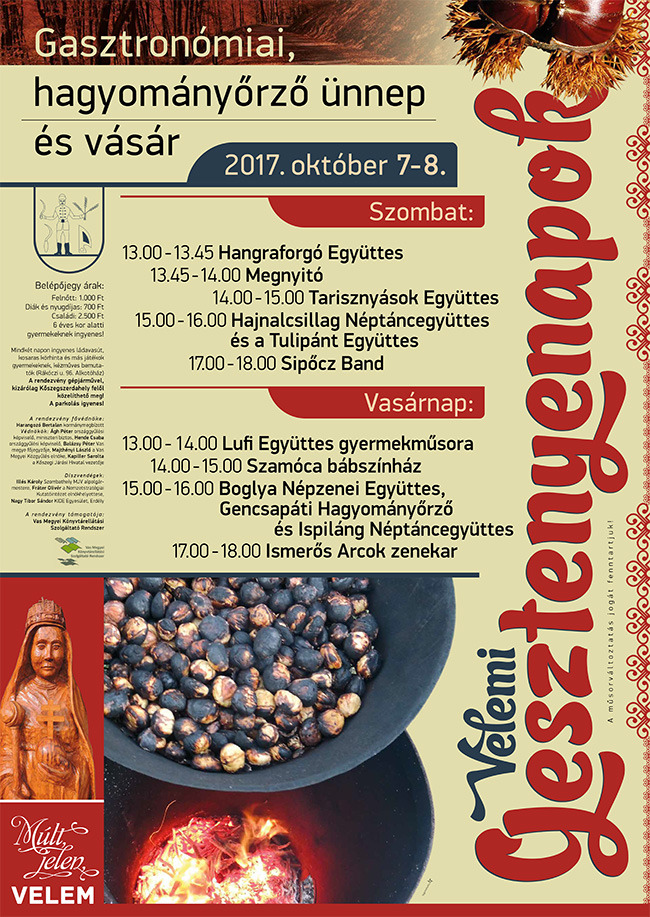 A Velemi Gesztenyenapok nagyszerű alkalom arra, hogy a mai rohanó világunkban megálljunk egy kicsit, és gyönyörködjünk a természet szépségében, a műsorokban, és átadjuk magunkat a gasztronómiai élvezeteknek. Október 7-8-án Velemben rendezik meg a környék egyik leghangulatosabb, leglátogatottabb szabadtéri rendezvényét, ahol a gesztenyéhez kapcsolódó gasztronómiai különlegességek, népművészeti bemutatók, gyermekjátszók, táncos és nívós zenei programok várják a vendégeket.