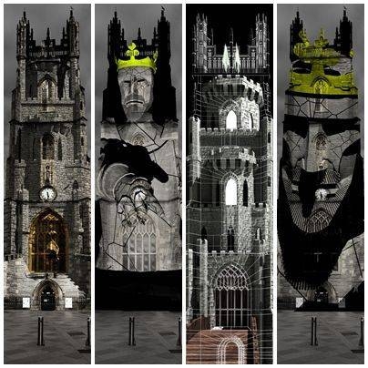 A Montgomeryben I. Eduárd angol király által máglyára küldött ötszáz bárd legendáját látványos, színes fényfestéses technológiával vetítették ki a 12. században épült cardiffi Keresztelő Szent János-templom tornyára.