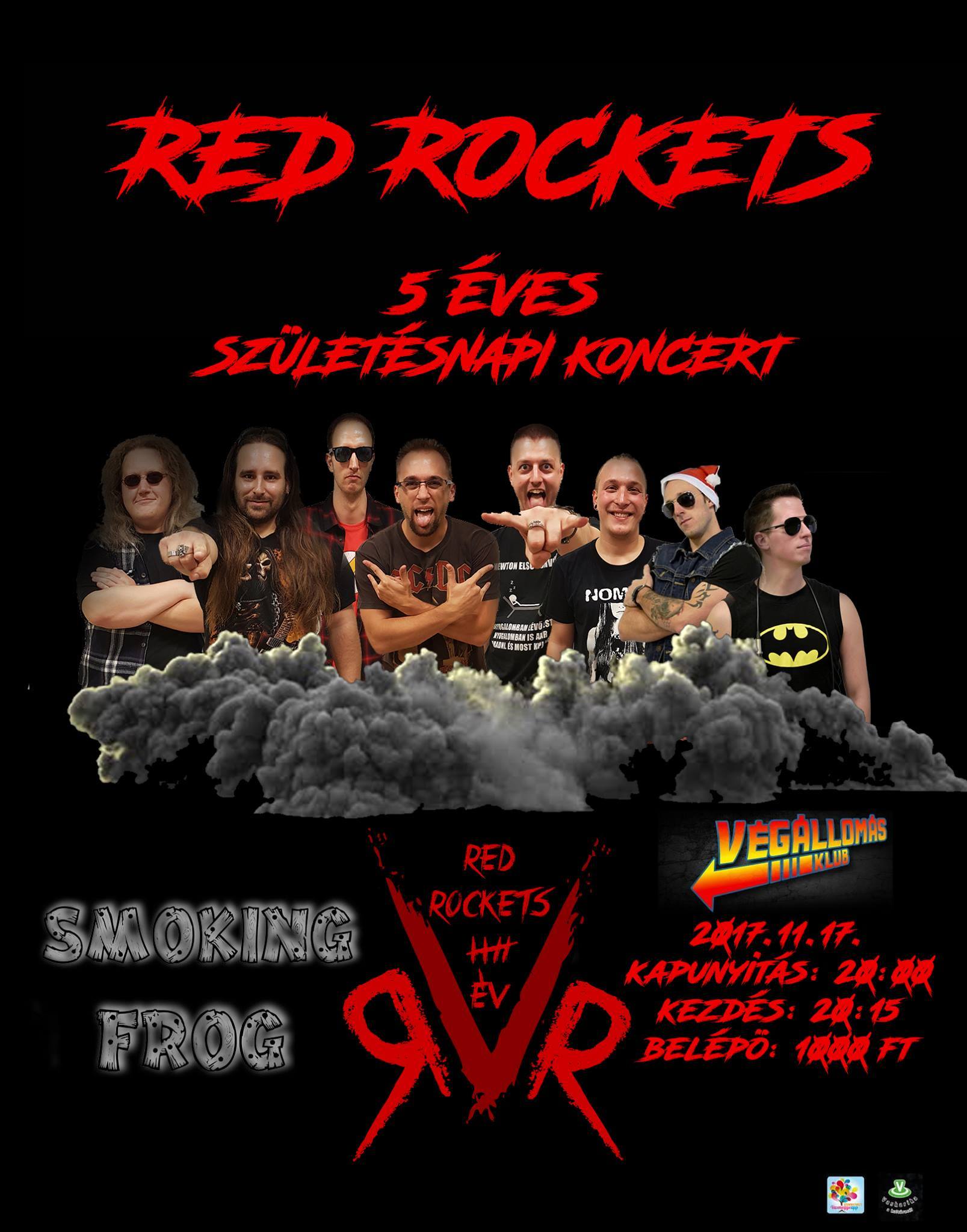 Az egyik legreményteljesebb helyi rockbanda, a Red Rockets tartja 5. születésnapi nagykoncertjét. A koncerten tiszteletét teszi pár dal erejéig minden régi, és pár annál is régebbi zenésztárs! Maratoni hosszúságú koncerttel és plusz látvánnyal is készül a banda a jeles eseményre. A színpadot Szombathely legújabb üdvöskéje a Smoking Frog fűti fel.
