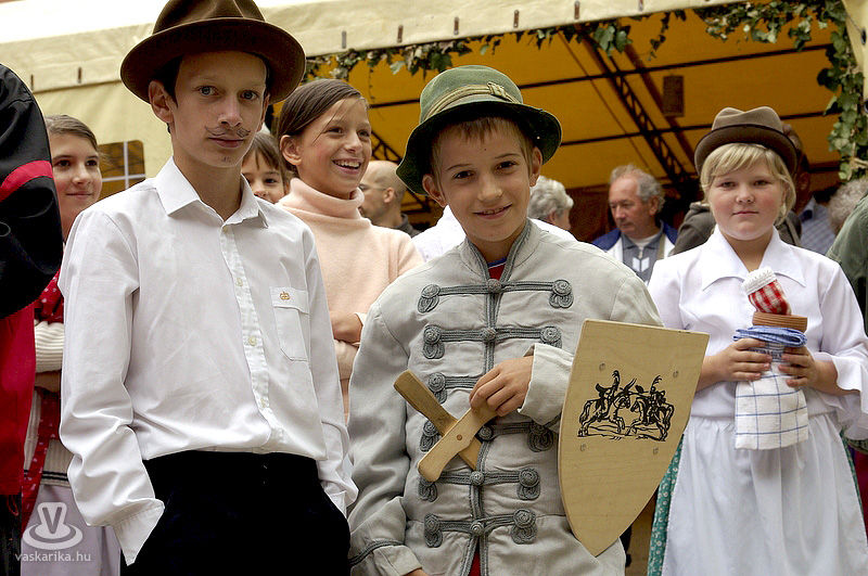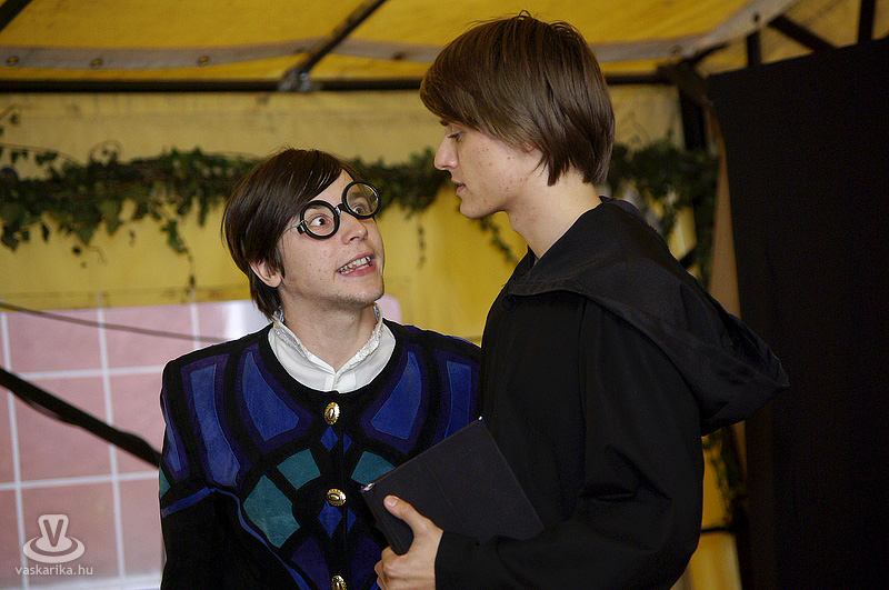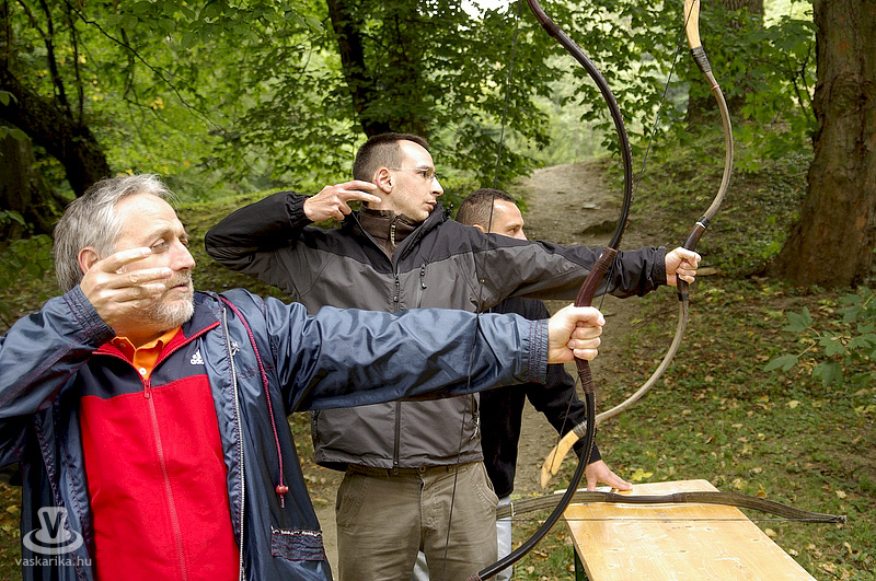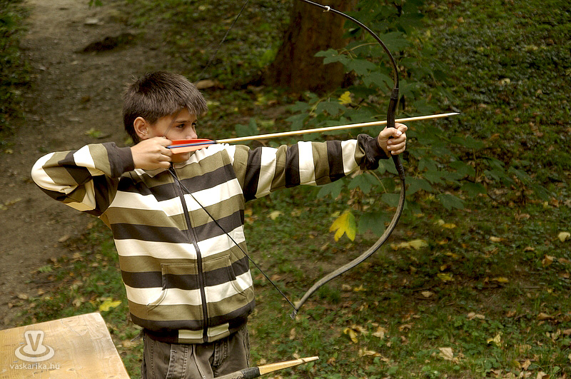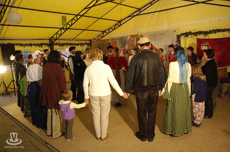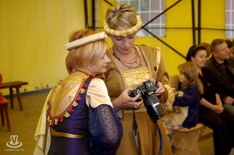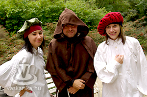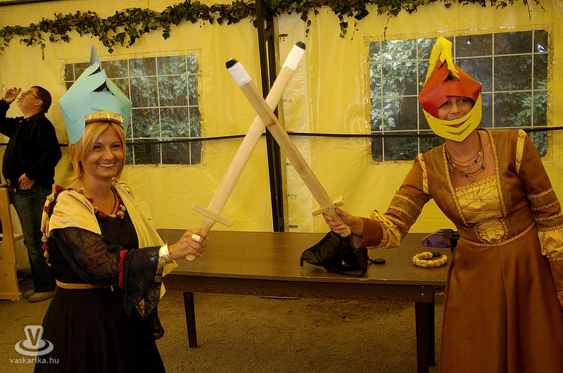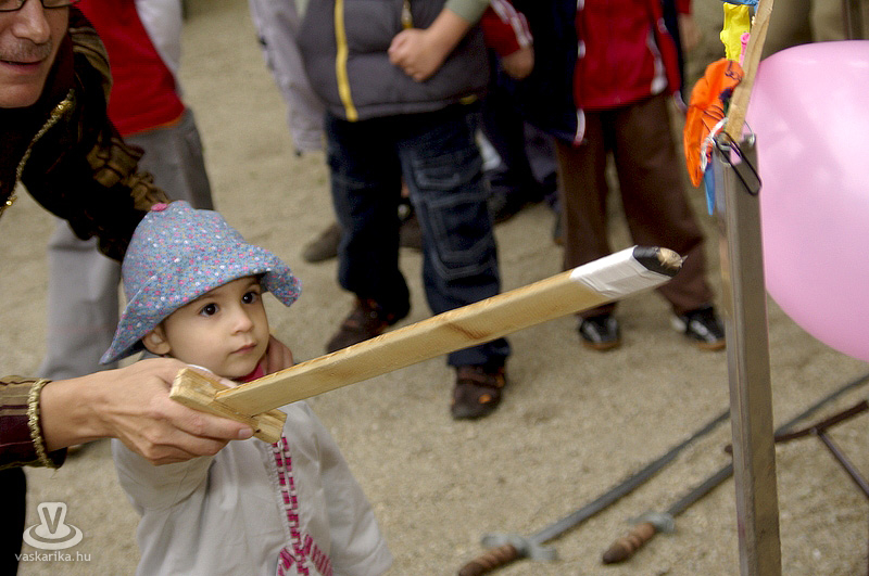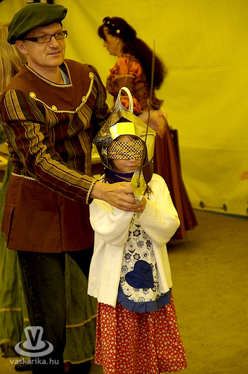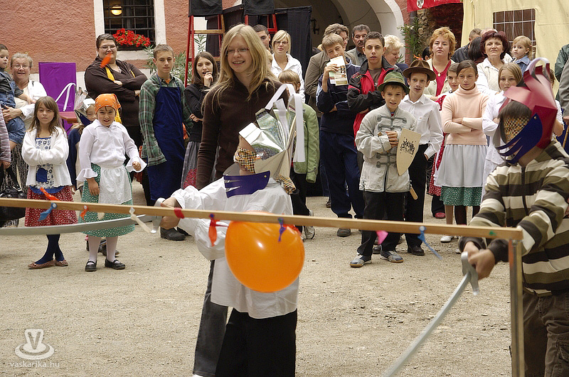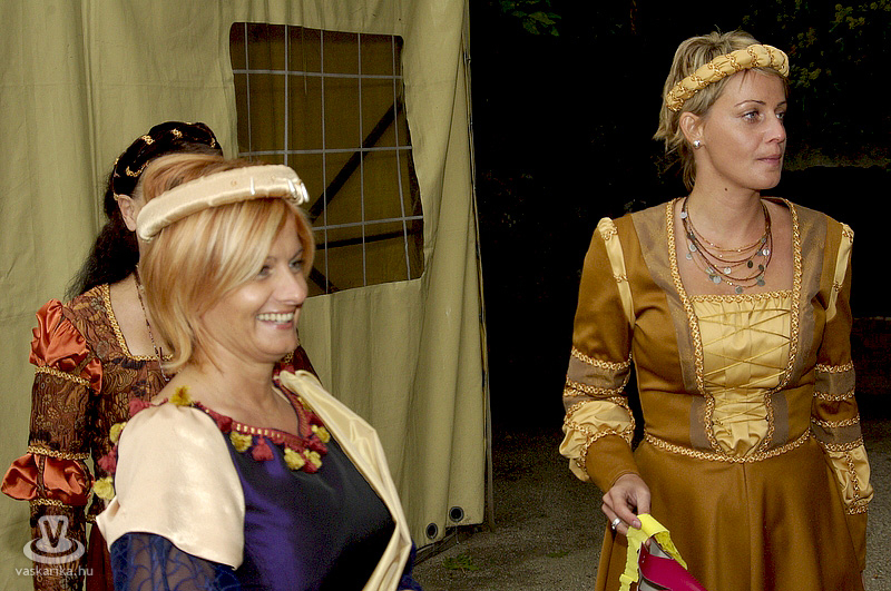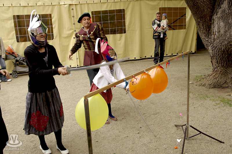 A kastélyudvaron felállított sárga sátorba a Folktarisznya udvari zenéje és a korhű öltözetben szorgoskodó MMIK-s "udvarhölgyek" vittek életet, míg a kastélyoldalban íjászkodásra nyílt lehetőség. Lehet, rosszul választottam meg a célzóvizet, mert rendesen körbelőttem a célterületet. Meg is kaptam útravalóként, hogy jobb, ha nyíl helyett a saját vesszőmnél maradok. Mármint az íróeszköznél, vagyis az íjászkodás okozta lelki traumát egyedül a klaviatúrával tudnám felülírni magamban. A kétes siker után irány a kastély másik oldala, ahol csuhás barát "térítette" lengőtekézni, és egyéb ügyességi játékok kipróbálására az érkezőket.