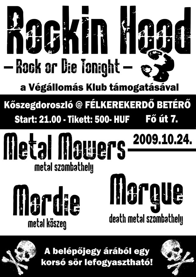 Október 24-én, szombaton Kőszegdoroszlón a Félkerekerdő Betérőben harmadik alkalommal kerül megrendezésre a Rockin Hood névre keresztelt mini fesztivál. A stílus ezúttal kicsit keményebb lesz a megszokottnál, a metal zene kedvelői viszont biztosan nagyon jól fognak szórakozni. Erről két szombathelyi banda, a Metal Mowers és a Morgue, valamint Kőszegről a Mordie fog gondoskodni. Kezdés este 9 órakor, a belépő 500.- Ft, melynek árából ráadásul egy korsó sör lefogyasztható.