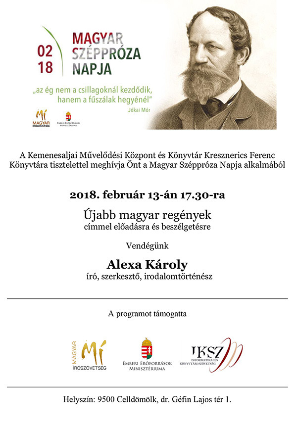 Február 13-án, Celldömölkön a Kemenesaljai Művelődési Központ és Könyvtár Kresznerics Ferenc Könyvtára látja vendégül Alexa Károly irodalomtörténészt, aki az újabb magyar regényekről beszélget az érdeklődőkkel.