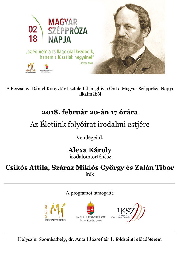 Február 20-án öt órakor az Életünk irodalmi est keretében kerekasztal beszélgetésre kerül sor, Alexa Károly főszerkesztő beszélget Csikós Attila, Száraz Miklós György és Zalán Tibor írókkal. A három alkotó neve ismerősen csenghet, hisz verseik, novelláik, tárcáik rendszeresen közlésre kerülnek az Életünk számaiban, mindemellett méltán mondhatjuk, hogy a magyar széppróza ismerői, művelői is egyben.