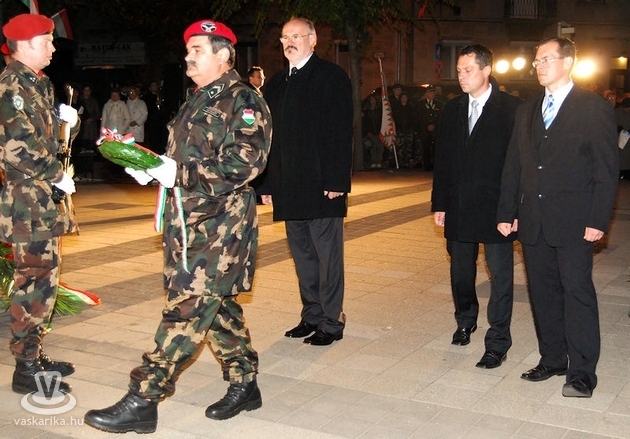 A Március 15. téren Szombathely Város Fúvószenekara zenéjére gyülekeztek a megemlékezők. A Magyar Honvédség 12. Arrabona Légvédelmi Rakétaezred díszalegysége katonai tiszteletadással felvonta az országzászlót. Az Oladi Simon István Utcai Általános Iskola és a Teleki Blanka Szakképző Iskola diákjainak műsora után dr. Hende Csaba országgyűlési képviselő mondott ünnepi beszédet. Stílusosan a XX. század 1848-ának nevezte 56-ot, ami tökéletesen illett a hely szelleméhez, hiszen épp az 1848-as forradalom kitörésének dátumát őrző tér kockáin mondta mindezt.