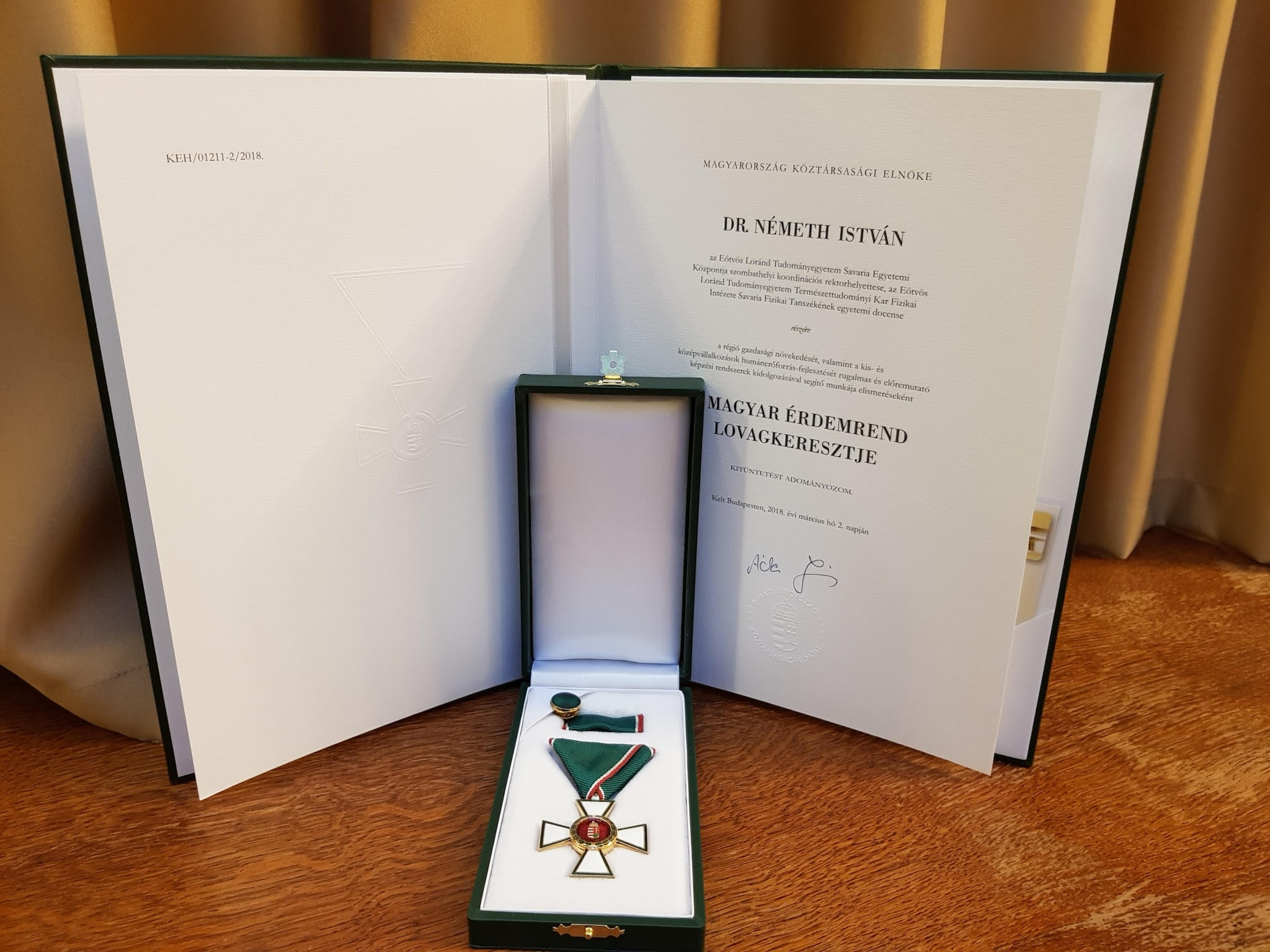 A magas rangú állami kitüntetést a március 15-ei nemzeti ünnep alkalmából Áder János köztársasági elnök megbízásából Varga Mihály nemzetgazdasági miniszter adta át. Az ELTE Savaria Egyetemi Központ szombathelyi koordinációs rektorhelyettese az elismerést szerda délután vette át Budapesten, a Nemzetgazdasági Minisztériumban.