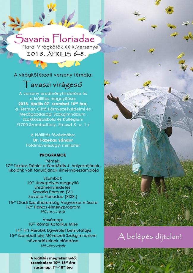 Az idei Savaria Floriadae versenyt április 6-8. között rendezzük meg. Az előző évekhez hasonlóan a feladatok összeállítója a Virágkötők, Virágkereskedő Vállalkozók Magyarországi Szakmai Egyesülete.