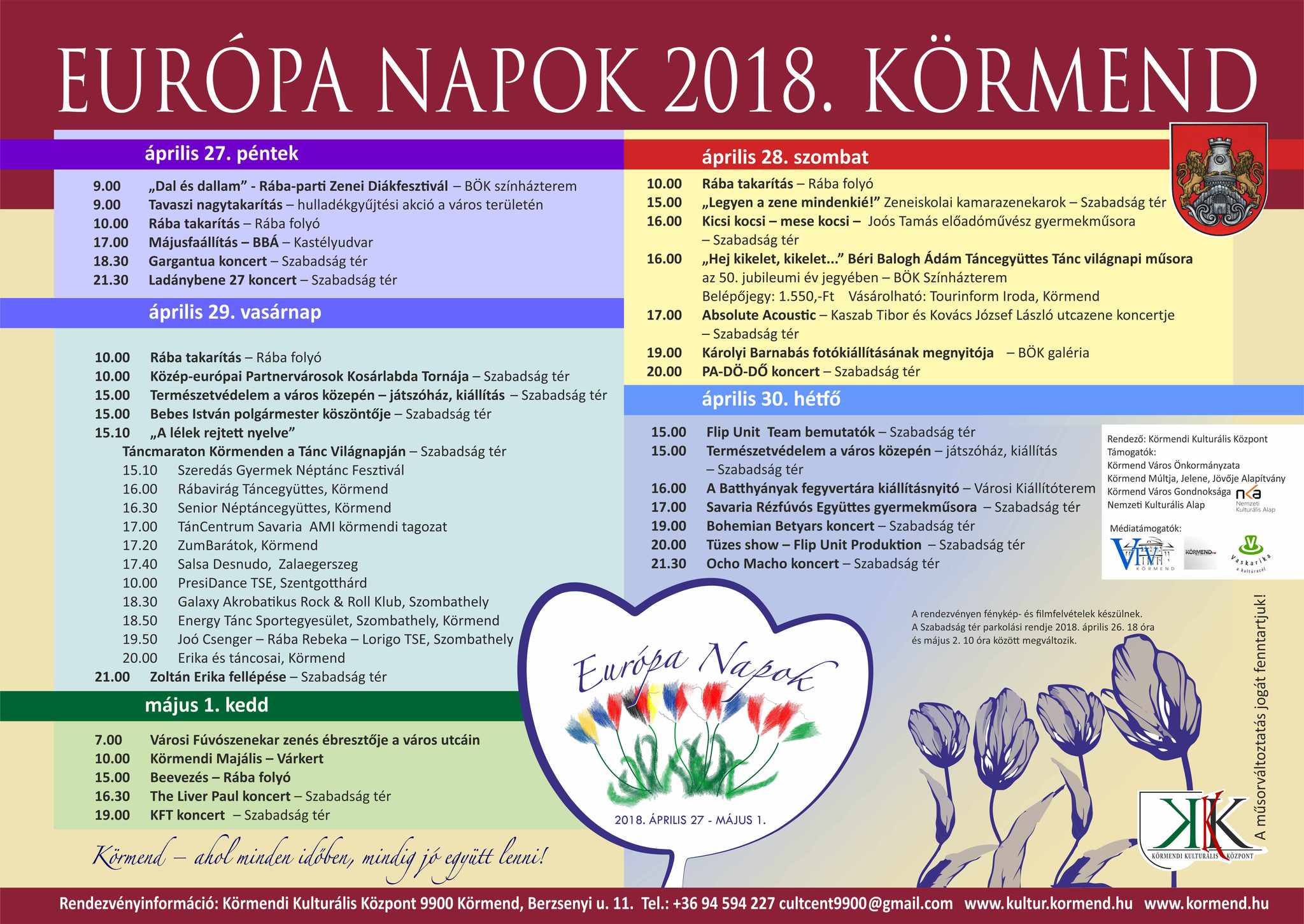 Öt éve indult útjára hagyományteremtő céllal a város központjában, a város testvérvárosait is megszólítva a nagysikerű Európa Napok rendezvénysorozat. Ebben az évben is hívják-várják Európa polgárait, a körmendieket az április 27. - május 1. között megrendezésre kerülő fesztiválra.