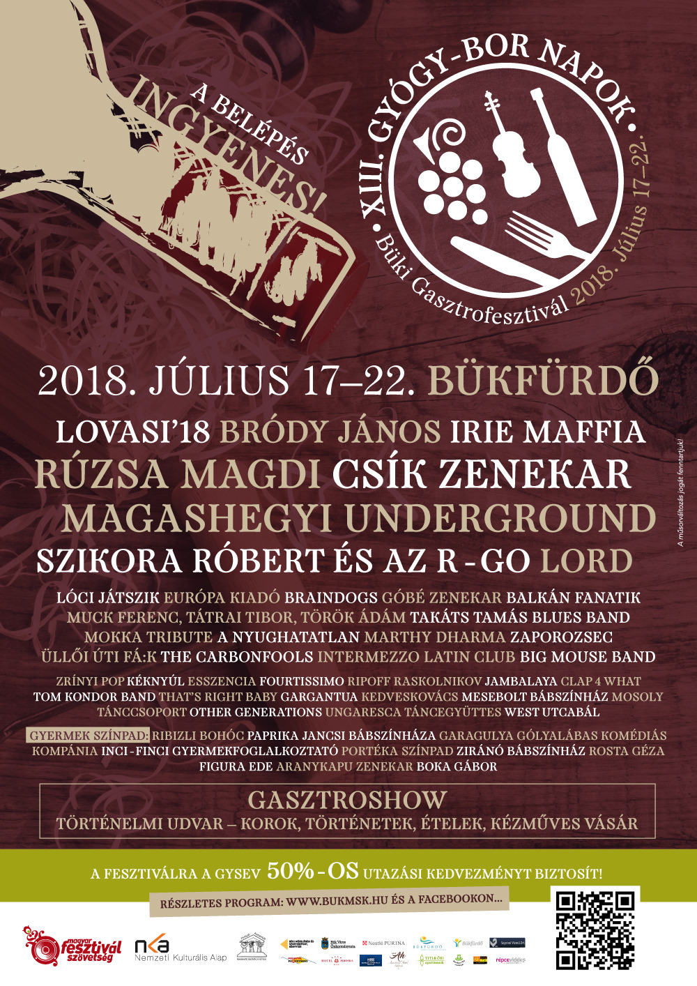 Július 17-22. között a megye fesztiválszékhelye lesz Bükfürdő, középpontban hatnapos gasztroattrakciójával, a 13. Gyógy-Bor Napokkal, amin történelmi korok étkei, számos pincészet borkínálata és hét színpad zenei- és gyermekprogramja várja a zene és a gasztronómia szerelmeseit. Ismertetjük a fesztivál részletes programját!