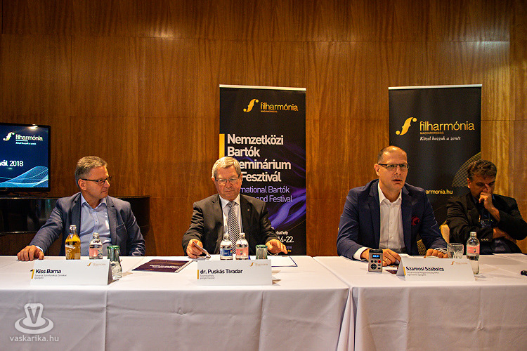 A sajtótájékoztató résztvevői (b-j): Kiss Barna, a Savaria Szimfonikus Zenekar igazgatója, dr. Puskás Tivadar polgármester, Szamosi Szabolcs, a Filharmónia Magyarország Nkft. ügyvezetője és Hamar Zsolt, a Nemzeti Filharmonikus Zenekar zeneigazgatója