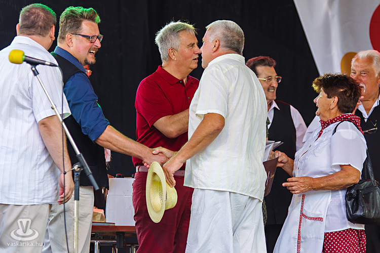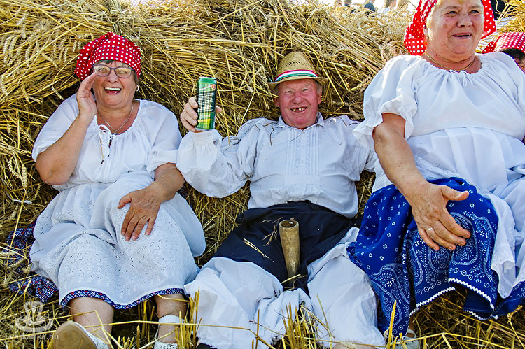 Szerencsére a színpadon és a búzatáblák közt is láttunk fiatal aratókat - többek közt a vitnyédieket, akiket két szegedi "idegenlégiós" is erősített, méghozzá vitnyédi népviseletben, amit előző este "ügyeztek le" néhány pálinka legurítását követően - míg a bemutatásoknál kiderült, hogy a nagygeresdi aratócsapat marokszedője, Takács Katalin a kezdetektől, azaz 28. éve képviseli települését ezen a rendezvényen.
