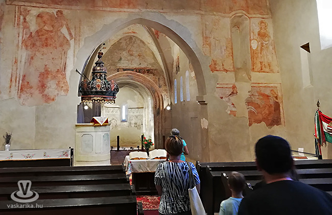 A két padsor között balra látható a szószék, amelynek szépen faragott, festett koronája - felirata szerint - 1792-ben készült.