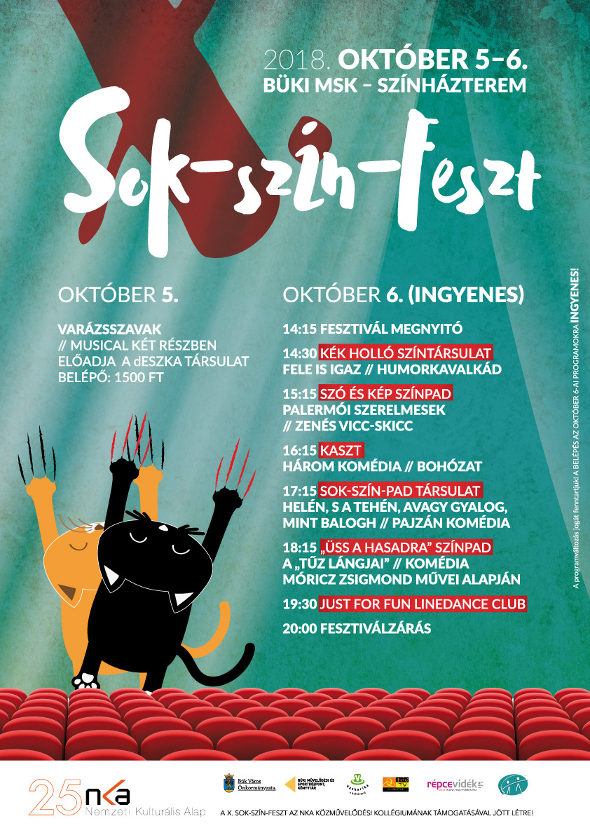 A Sok-szín-pad Társulat színjátszó fesztiválja ismét várja a színházkedvelő közönséget, ugyanis október 5-6. között tizedik alkalommal telik meg a Büki Művelődési Központ színjátszókkal. A helyi csapat, a Sok-Szín-Pad Társulat jubileumi házi fesztiválját szervezi a hétvégére. A jókedv garantált!
