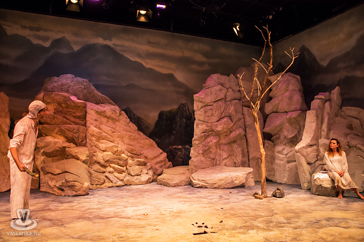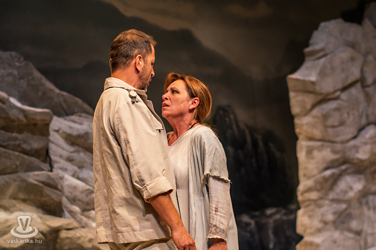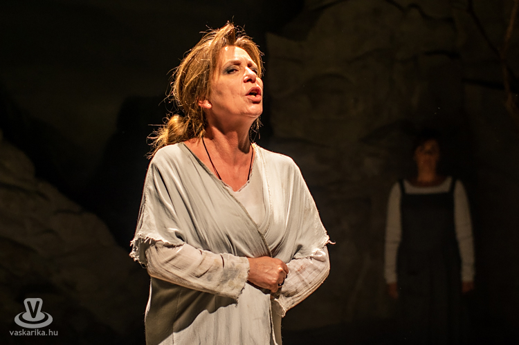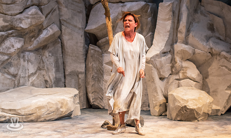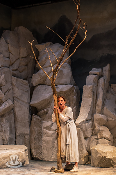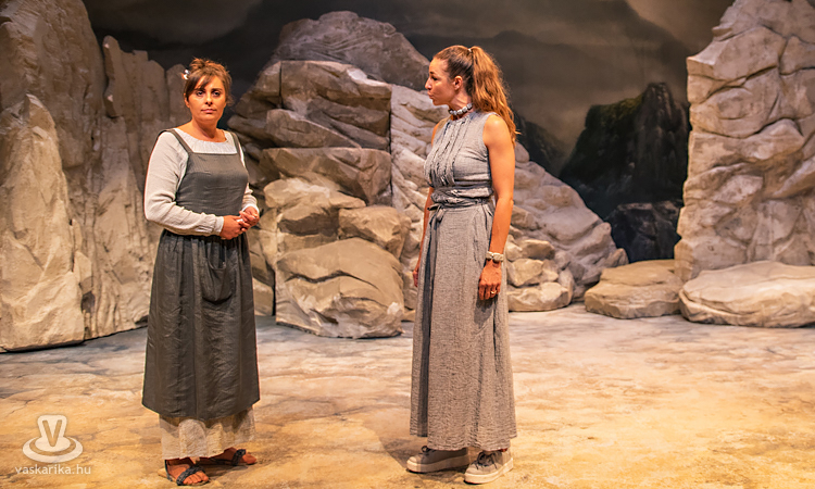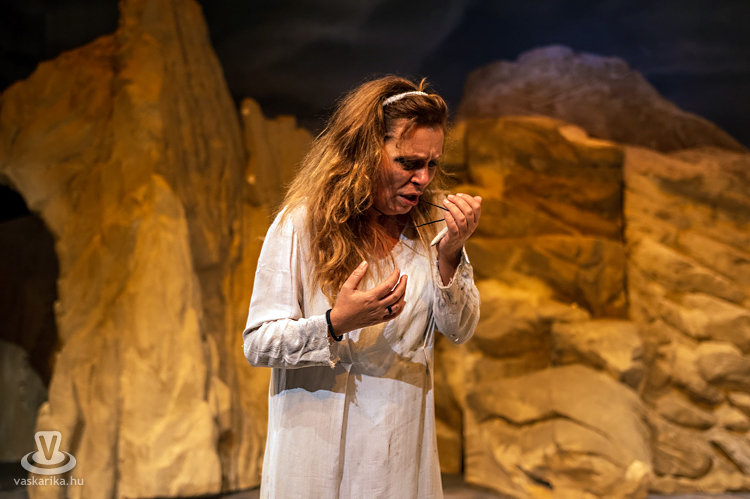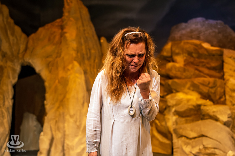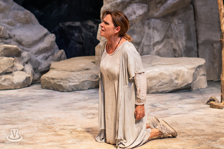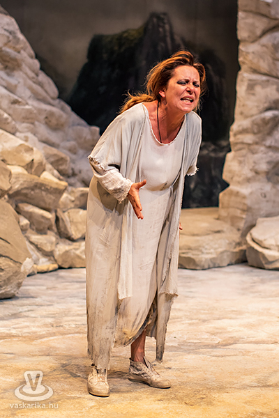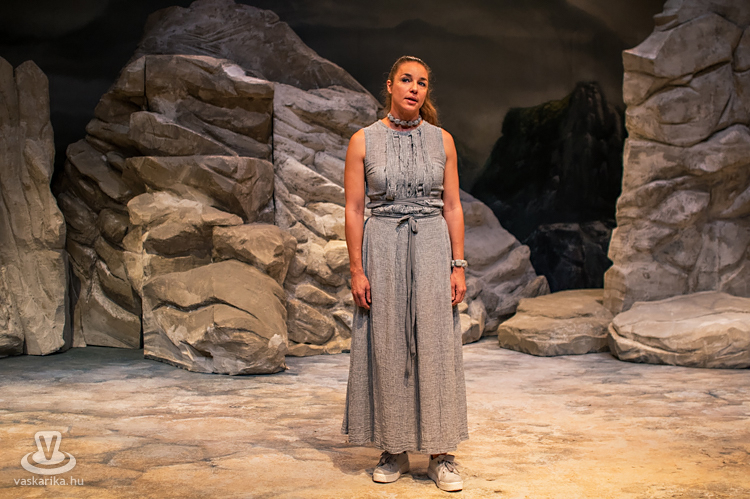 Mit tesz ilyenkor az elhagyott asszony? Kiüresedettnek érzi magát, hiszen a férfi miatt hagyta el a saját hazáját, melyet ráadásul barbárnak tartanak Korinthoszban. Németh Judit egész megjelenése, arckifejezése, ruházata, mozgása, haja, taglejtése kiválóan tükrözi a fájdalomtól megtébolyodott, de valahol mégis racionálisan gondolkodó nőt. A díszlet ókori görög tájat idéz, hatalmas sziklákkal, kicsit misztikus hangulattal, régi időkbe röpít, s időnként lecsap ránk a ma, egy tűsarkú cipő, egy ajakfényesítő, egy horgészszék vagy egy-egy kifejezés formájában.