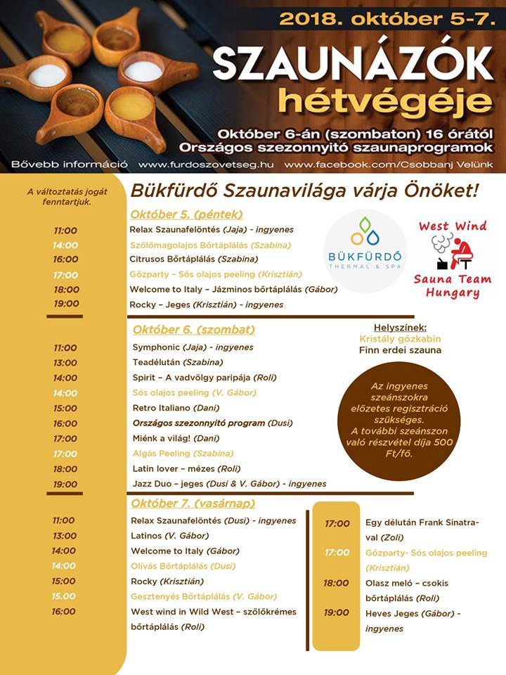 A három napot érintő hétvége során a csatlakozó fürdők szabadon szervezhetnek a szaunázáshoz kapcsolódó programokat, központilag egyetlen esemény lesz: október 6-án 16.00 órától a csatlakozó szaunákban ugyanaz a tematikus szauna program fog megvalósulni az ország több településén Bükfürdőtől Debrecenig, azaz ugyanazokkal az illatokkal, ugyanarra a zenére tartanak felöntést a szaunamesterek, így abban a néhány percben lesz a legtöbb egyszerre szaunázó ember Magyarországon.