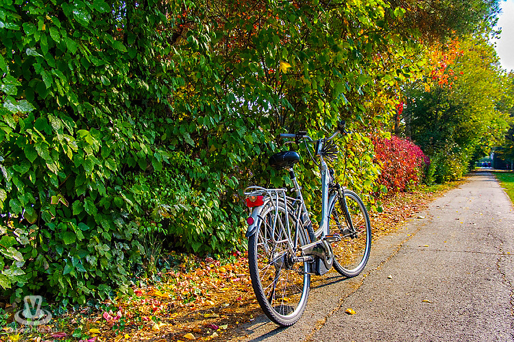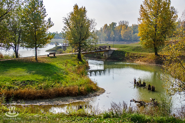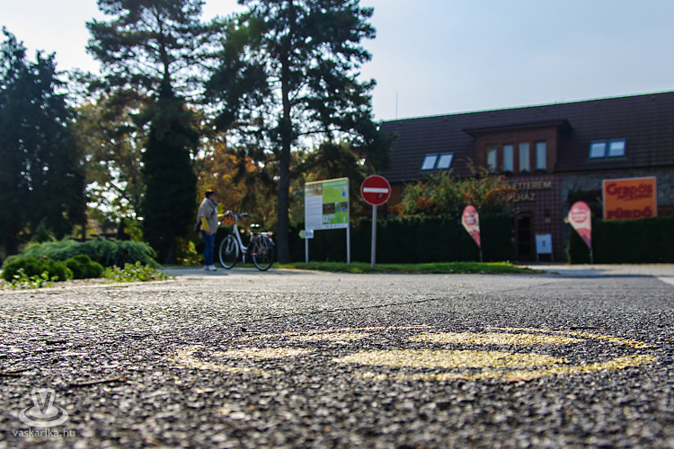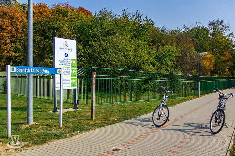 Az irányt a fürdő nyári bejárata felé vettük, és a térkövezett, minősített nordic walking útvonalon haladtunk tovább a Fürdő Étterem előtt, a kemping kerítése mentén. A térköves út végén jobbra fordultunk, amit tábla is jelzett: a Bernáth Lajos sétány árnyas fái alatt gurultunk tovább. Az aranysárga színvilág és a falevelekkel borított kerékpárút igazi szippantás volt az őszből és a kellemes, bringázásra ideális időből.