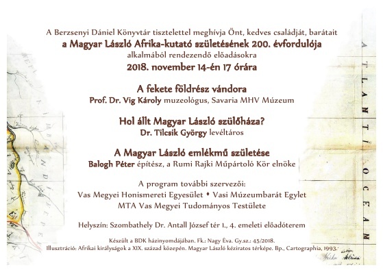 Magyar László Afrika-kutató születésének 200. évfordulójára előadásokkal emlékezik a Berzsenyi Dániel Könyvtár, az MTA Vas Megyei Tudományos Testülete, a Vas Megyei Honismereti Egyesület és a Vasi Múzeumbarát Egylet.