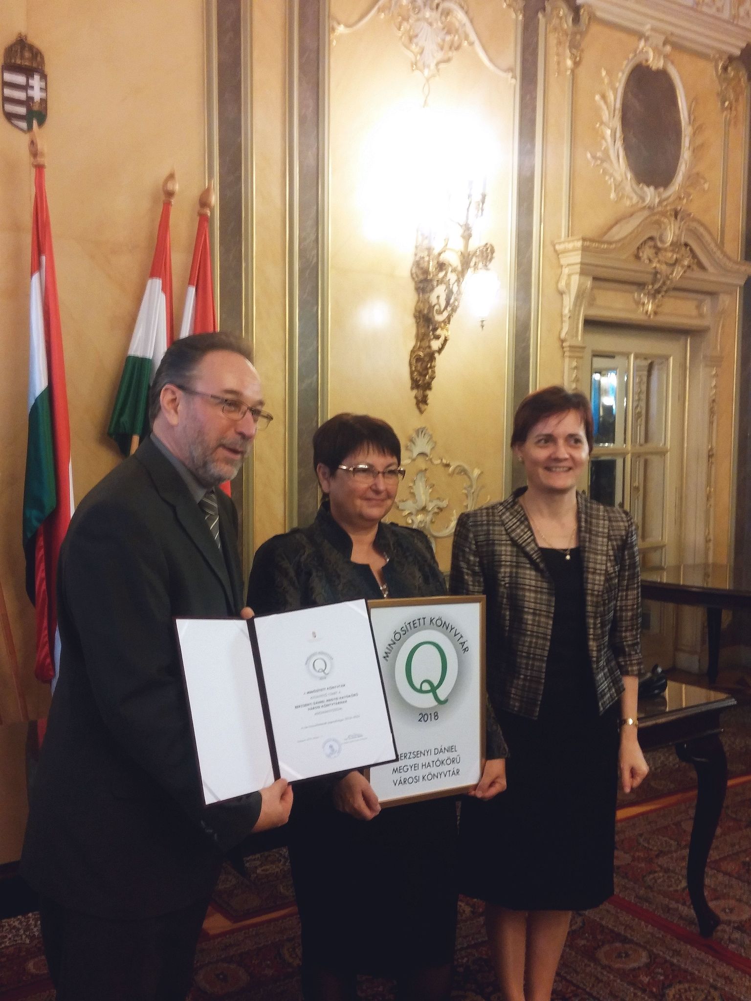 A címhez kapcsolódó díszoklevelet 2018. november 13-án vette át Nagy Éva igazgató a könyvtár minőségirányítási rendszerének felelősével, Dr. Baráthné Molnár Mónika igazgatóhelyettessel együtt az EMMI Tükörtermében, Fekete Péter kultúráért felelős államtitkártól.
