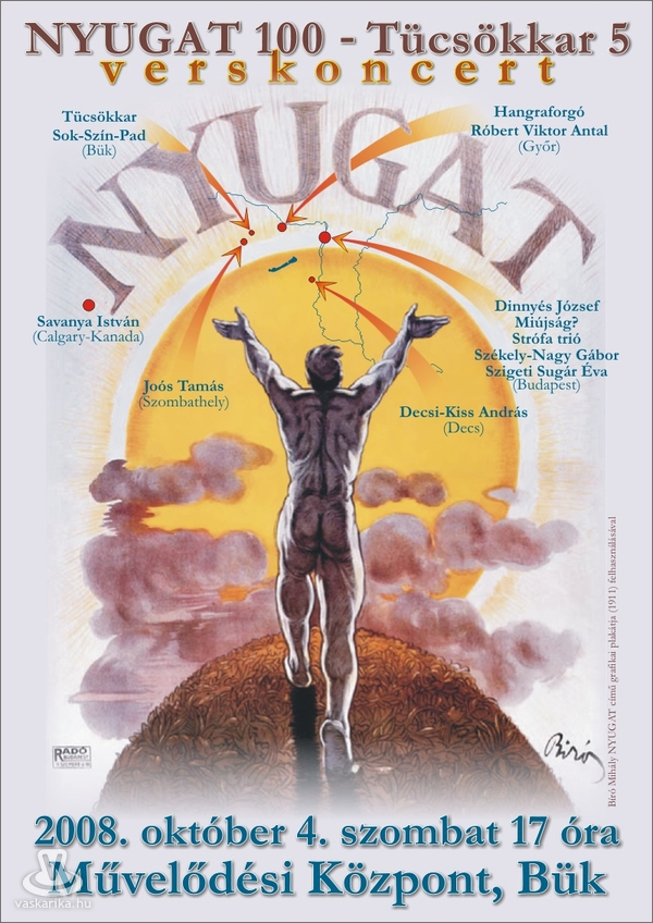"Nyugat 100 - Tücsökkar 5" címmel rendez verskoncertet a büki Tücsökkar 2008. október 4-én (szombaton) 17 órakor a büki Művelődési Központ színháztermében.