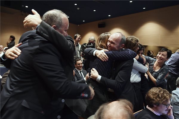 Porga Gyula (Fidesz-KDNP), Veszprém polgármestere (jobbról) ünnepli a bejelentést az Európa Kulturális Fővárosa 2023 projekt eredményhirdetésén a fővárosi Müpában 2018. december 14-én. Veszprém pályázatát támogatja az Európa Kulturális Fővárosa 2023 címre a projekt független nemzetközi szakértői testülete. MTI/Koszticsák Szilárd