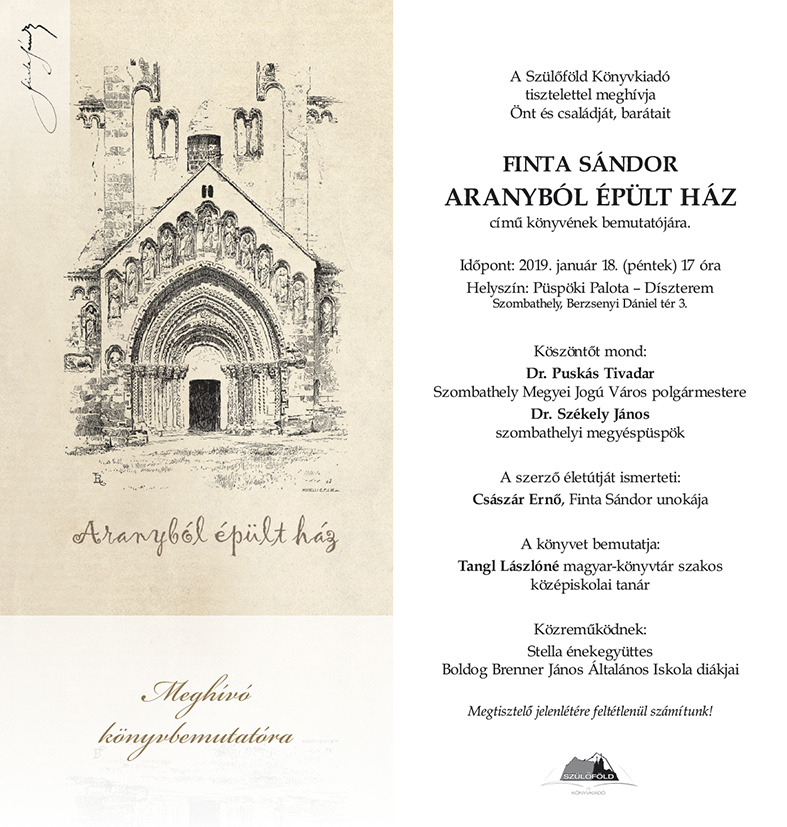 Ismét gazdagodott Szombathely egy bensőséges hangvételű, emberi érzésekkel teli kötettel. Közel száz éve íródott a Szülőföld Könyvkiadó gondozásában megjelent, Finta Sándor 1909–1949 között írt műveiből bemutatásra kerülő könyv.
