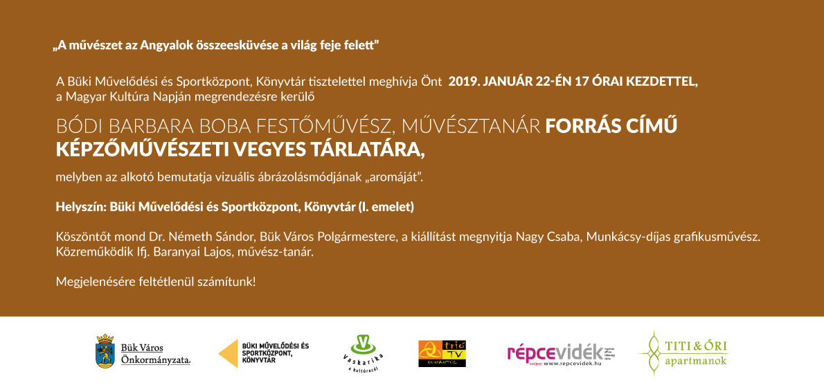 Január 22-én, 17 órakor a Magyar Kultúra Napja alkalmából Bükön Bódi Barbara Boba festőművész, művésztanár Forrás című képzőművészeti vegyes tárlata nyílik meg. Köszöntőt mond Dr. Németh Sándor, Bük Város Polgármestere, a kiállítást Nagy Csaba, Munkácsy-díjas grafikusművész nyitja meg. Az eseményen közreműködik ifj. Baranyai Lajos művésztanár.