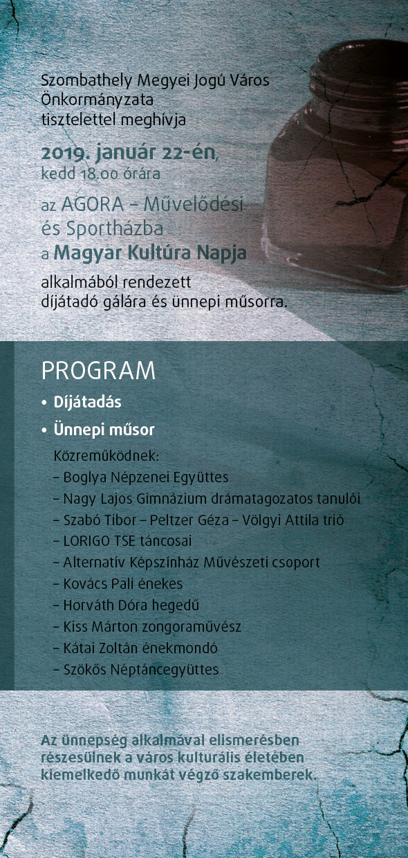 A Magyar Kultúra Napja díjátadó gálaműsorra ingyenes jegyek igényelhetők és átvehetők korlátozott számban az AGORA-Jegyirodában a következő időpontokban: 2019. január 18 (péntek) 17.00-ig, 2019. január 19. (szombat) 09.00- 13.00, valamint 2019.január 21-én (hétfő) 09.00-17.00.