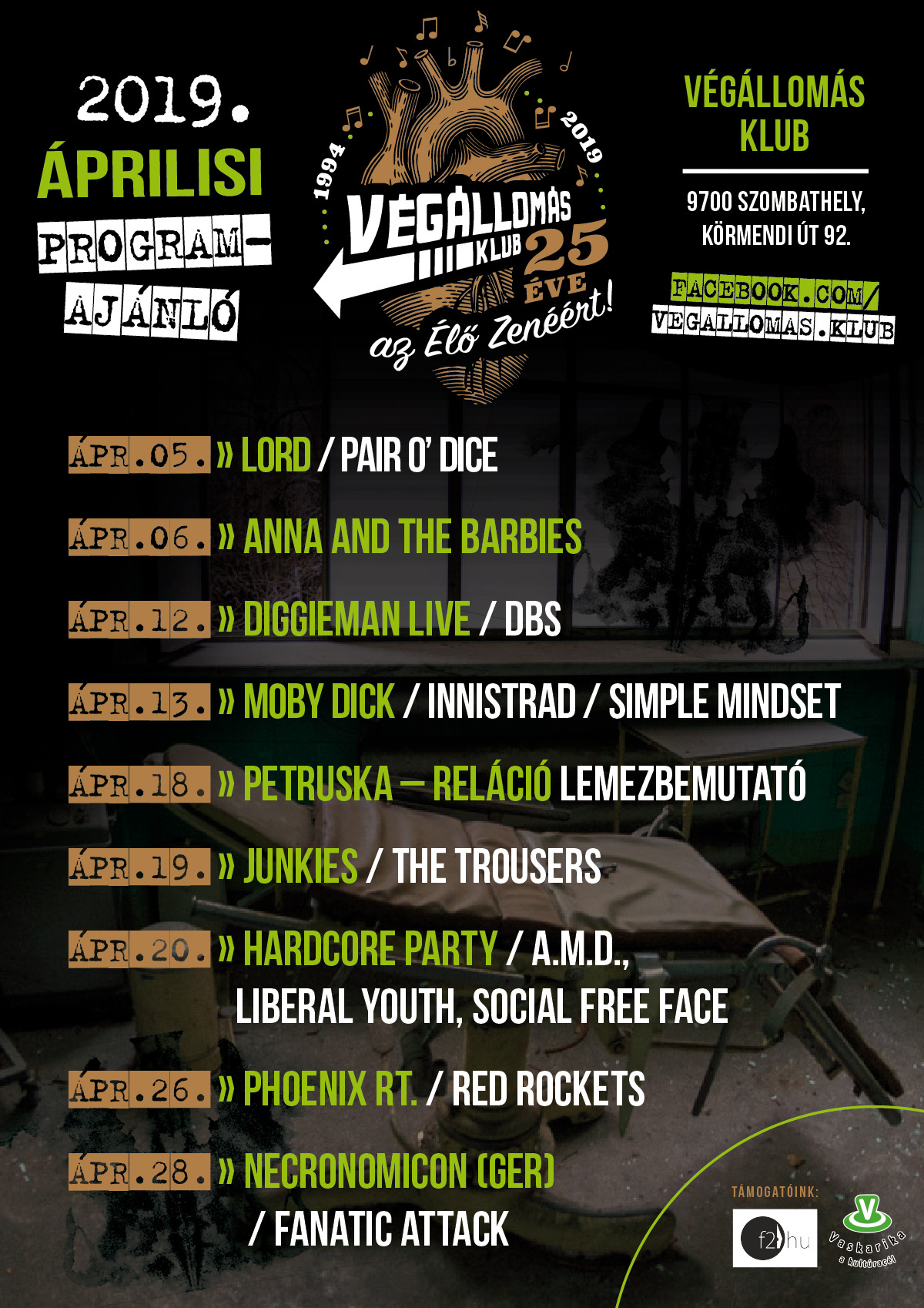 Szombathely legaktívabb, élőzenét nyomató klubja nem hagyja, hogy a fogtündér hülyére mossa az agyad, a rózsaszín álmok rozsdás szövőszéke pedig megbökje az ujjad! Jobb, ha a Végállomásban iszod a söröd két pogó vagy csáphenger közt áprilisban is! Mutatjuk a programját.