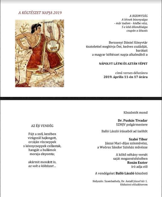 A Berzsenyi Dániel Könyvtár tisztelettel meghívja Önt, kedves családját, barátait a magyar költészet napja alkalmából a