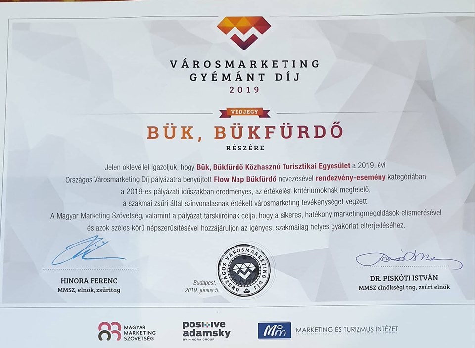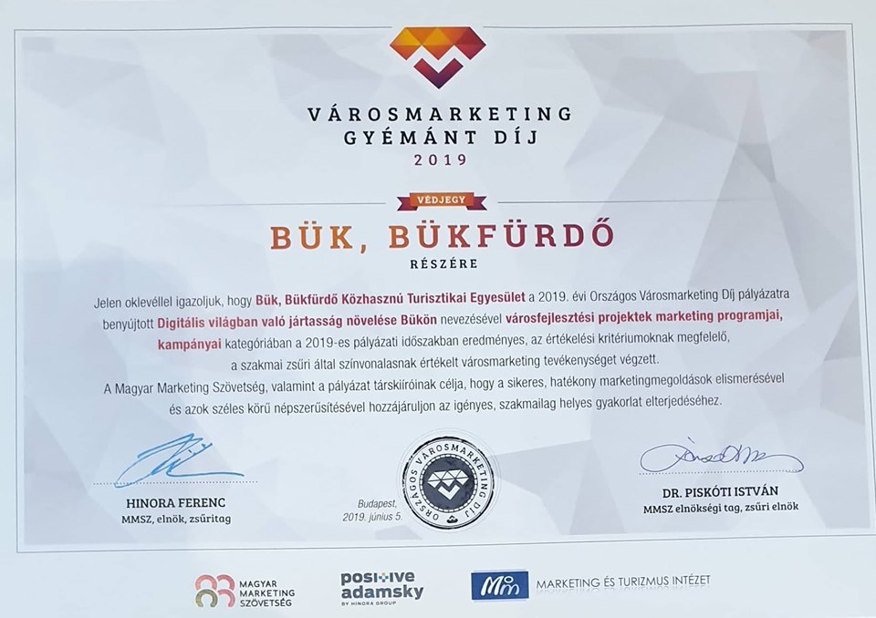 A Magyar Marketing Szövetség által 2019. június 5-én megrendezett Országos Városmarketing Díjátadón mindkét büki, bükfürdői pályázat városmarketing gyémántdíjban részesült.