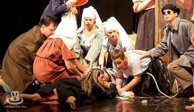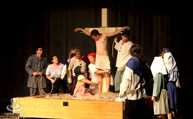 Hihetetlen, furcsa világba csöppenünk már az első jelenetben. Három férfi leszáll a vonatról, s arról beszélgetnek, hogy jön az aratás, és a világvége. Közben egy asszony kalauzra emlékeztető ruhában, piros-zöld színű indítótárcsával a kezében csatlakozik hozzájuk. Utóbbi azért is fontos, mert végig a piros felét mutatja felénk. Ez jellemének tagadó voltára emlékeztet, mely az egész darab során végigvonul. Bár később ő lesz Pilátus felesége, annak ellenére, hogy a „Szűz anyám" kijelentés számtalanszor elhagyja a száját, és ő cipeli a kereszt szárát, amit még a fejével is képes a levegőben tartani. De igazából mégsem hisz, sőt, ha úgy adódik, ugyanúgy iszik, és részt vesz az árulásban, ahogy a többiek is...