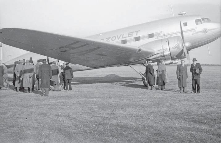 Beszállásra készülnek az utasok a MASZOVLET egyik Li-2-es repülőgépébe a szombathelyi légikikötőben 1948-ban. Fotó: Bárány Mihály (Savaria Múzeum TO, FH 2630)