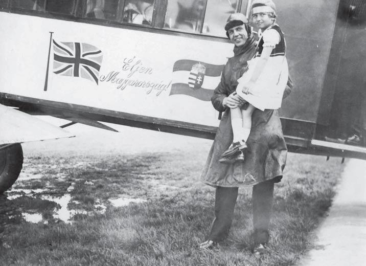 Lord Esmond Harmsworth karján egy őt köszöntő kislánnyal. Az utasszállító oldalán a brit és a magyar zászlók között „Éljen Magyarország!" felirat. A felvétel 1928. május 25-én készült Szombathelyen