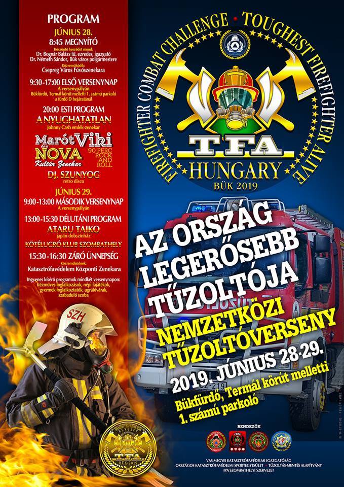 A tavalyi évben nagy sikert aratott, Vas megyei helyszínen megrendezett TFA (Toughest Firefighter Alive), a legerősebb tűzoltók nemzetközi megmérettetése idén ismét a fürdőjéről híres Bükön hívja versenyre a legerősebb tűzoltókat. A június 28-29-én megrendezendő verseny látogatóit színes, ingyenes programok várják. A kétnapos versenyen az indulóknak különféle, tűzoltósporttal összefüggő feladatokat kell teljesíteniük védőfelszerelésben, egy erre a célra kiépített versenypályán. Az első napon Firefighter Combat Challenge feladatokkal kell megküzdeniük a tűzoltóknak, a második napon pedig hagyományos TFA feladatokkal találkozhatnak a nevezők. Valamennyi versenyszám külön is embert próbáló képességeket követel meg a versenyzőktől.