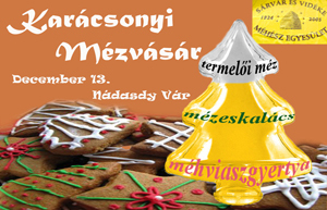 Karácsonyi mézvásárral, mézeskalács- és süteményvásárral, méhviaszgyertya árusítással és gyertyaöntési bemutatóval várják az édesszájúakat. A fazekas standon mézes csuprokat és edényeket lehet majd karácsonyi ajándékként beszerezni a fa alá. A programot a Sárvár és Vidéke Méhészegyesület szervezi, a mézvásár helyszíne sárvári Nádasdy-vár aulája, ahol egész napos program várja az érdeklődőket.