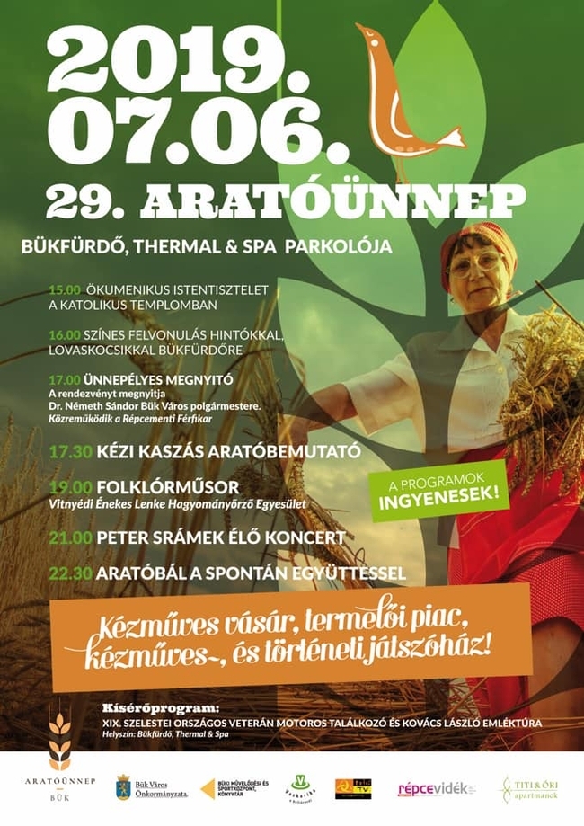 Július 6-án rendezik Bük legpatinásabb programját, a 29. Aratóünnepet, aminek fő látványossága az aratóbandák kézi kaszás bemutatója. A napot Peter Sramek koncertje és aratóbál zárja.