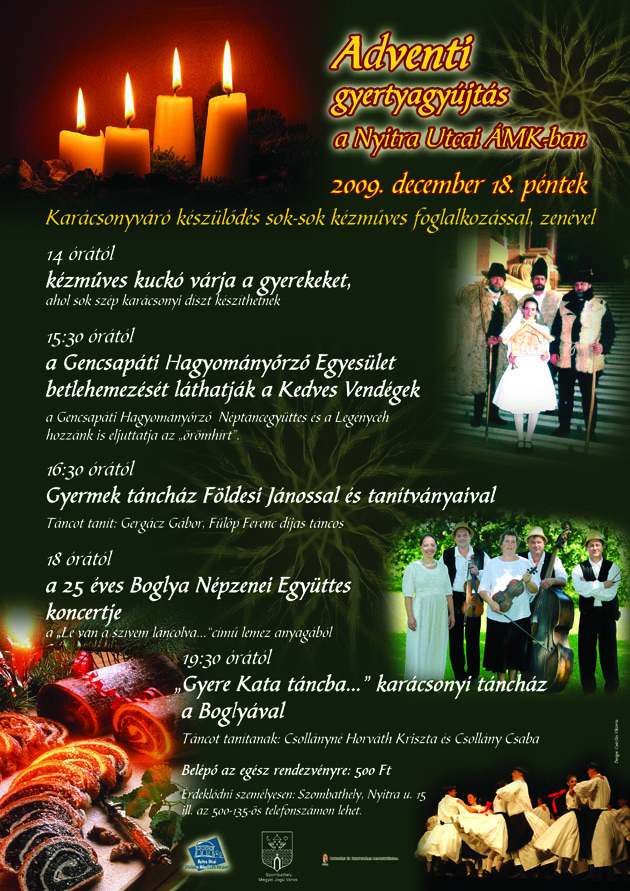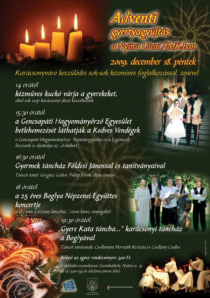 Karácsonyváró készülődéssel, adventi gyertyagyújtással és sok-sok kézműves foglalkozással várja december 18-án a Nyitra Utcai ÁMK az ünnepi hangulatra vágyókat. Este a Boglya Népzenei Együttes koncertje, valamint táncház szórakoztatja a közönséget.