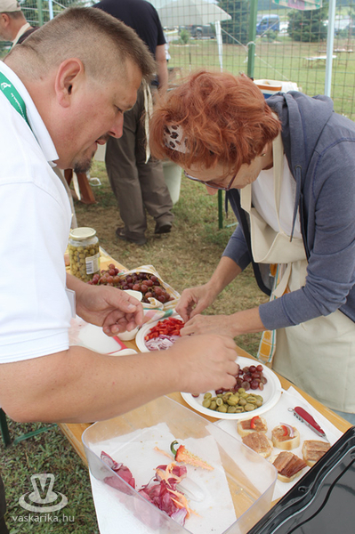 Közben elkészültek a csapatok étkei, amiket a zsűri asztalon mindenki megcsodálhatott. Szebbnél szebb tálalásokat, érdekes megoldásokat láthattunk a tányérokon, olyan volt az egész, mintha egy sokcsillagos étterem halvacsoráján járnánk. Jó volt látni, milyen gondosan helyezik a tálakat az asztalra, hogy finomítanak még egy utolsót, milyen kíváncsian pillantanak jobbra balra, megnézve a versenytársak főztjét. A zsűrinek nem volt könnyű dolga egyik kategóriánál sem. Az ételeket zsűrizte: Krizsán Zsuzsanna, Tóthné Tóth Erika, Garas Kálmán, Seregi Miklós, Konyher Tivadar, Karácsonyi Tamás, a zsűri elnöke Dr. Németh István volt.