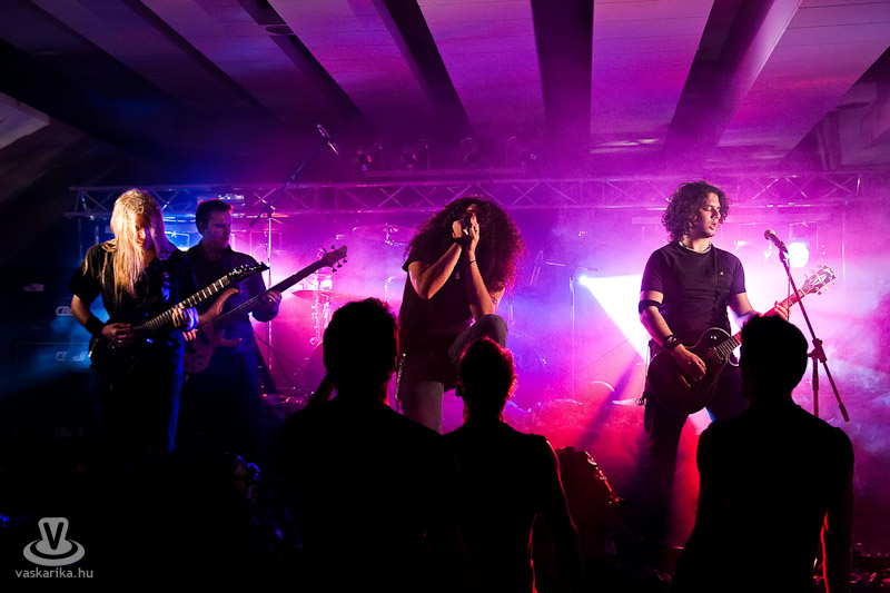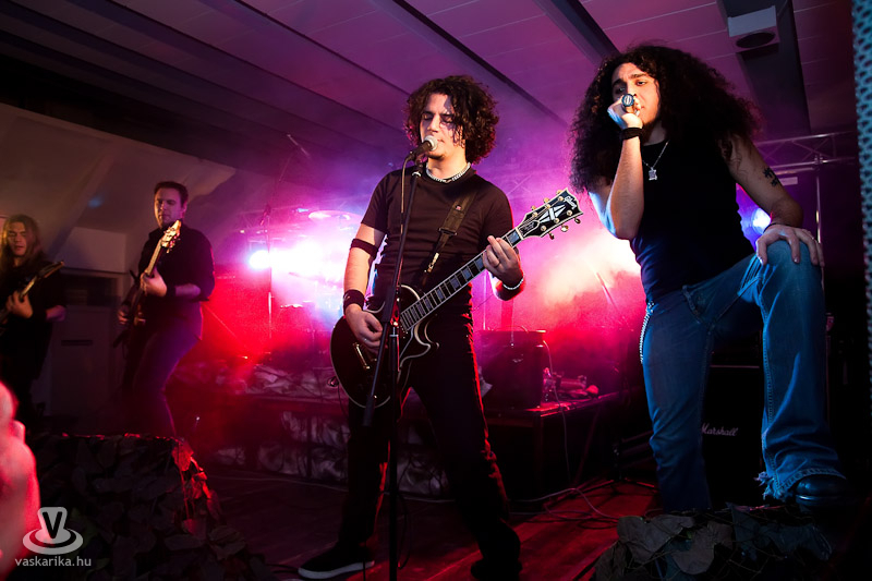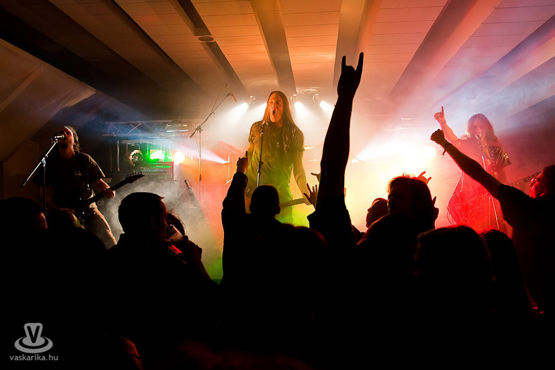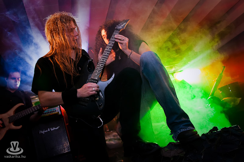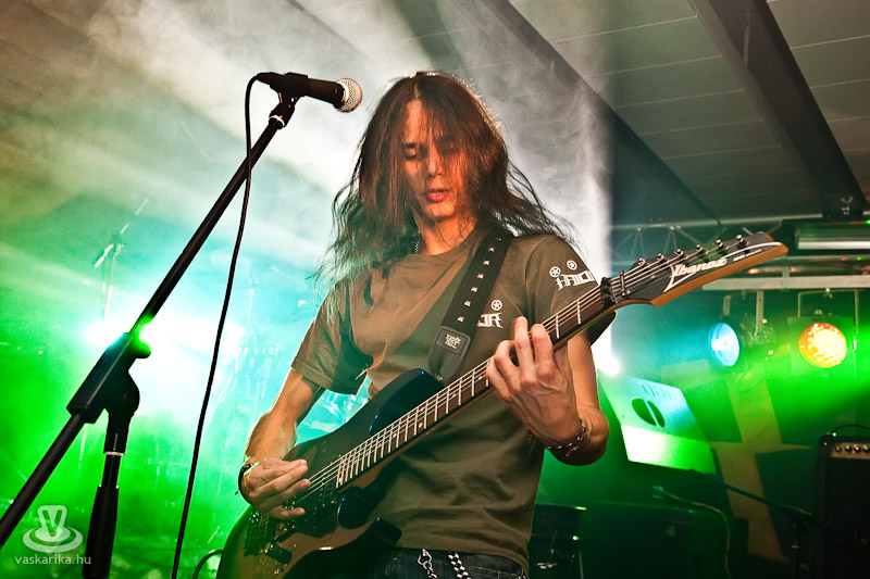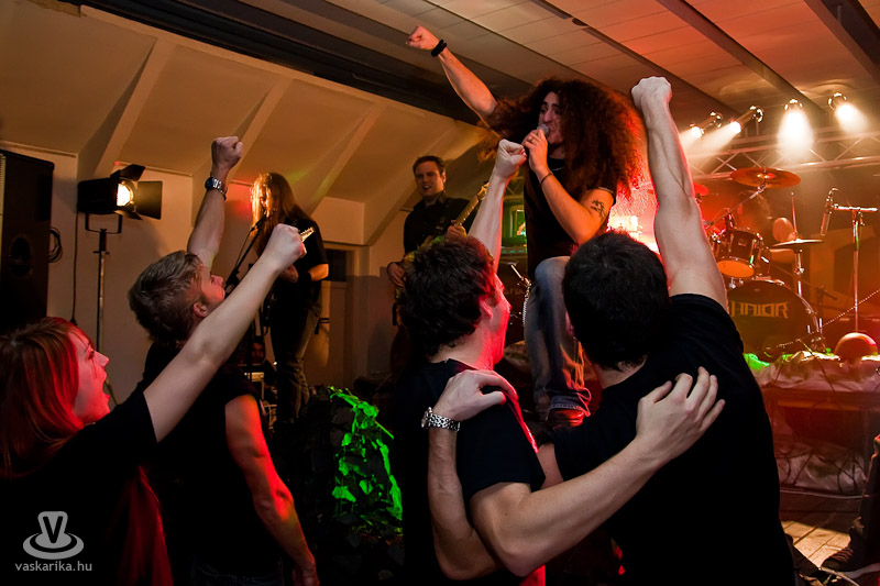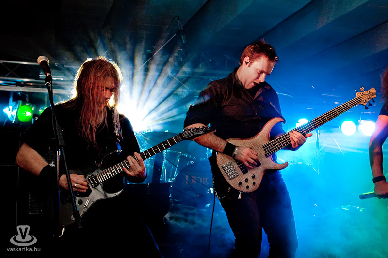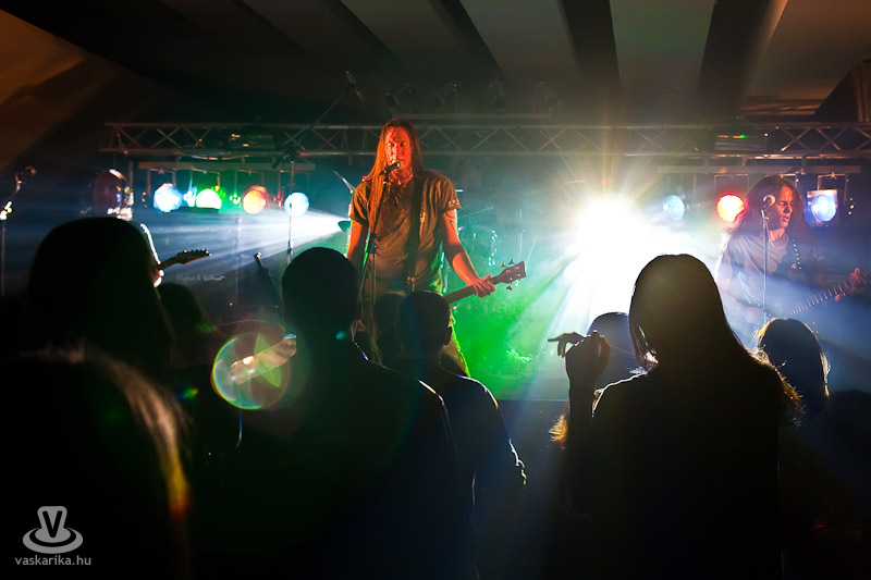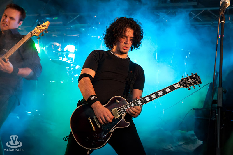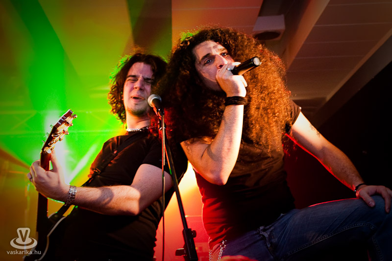 Ami viszont eztán következett, arra tényleg nehéz szavakat találni. Az előzetes beszélgetések alapján már derengett, hogy külhoni metal zenekarral is lesz dolgunk, mi mégis egy kicsit fáztunk a gondolattól, hogy bizony a Komondi fivérek öv alatt lepaktáltak a gyógyszeriparral, és éppen ezért képesek lesznek idehozni egy olyan cicomás olasz bandát, akik folytán az egy főre jutó nyugtatófogyasztás jelentősen megemelkedik a koncertlátogatók körében. Ehhez képest tátva maradt a szánk a talján Overtures produkciója láttán, hiszen az ikergitáros power metalban utazó négyes lerakta a bulit, ahogy kell. Hanggal, szerkóval, mindennel. Per Favore, megkockáztatjuk ezen a környéken az elmúlt két évben nem láttunk ilyen érett fellépést, túl azon, hogy egyénileg valamennyien uralták a hangszerüket, meg remek nótákat is hoztak, a színpadon pedig nem eresztettek betyárgittet a nacijukba. A maga nemében hibátlan prezentáció volt, még akkor is, ha ez a fajta sárkányölő-szegecspukizó metal tucatszámra árasztja el a piacot. Igaz ugyan, hogy sok minden szólt hátulról is, na de egy ilyen szintszőnyeges, instrumentális intermezzokkal nyakonöntött zenét nehéz is billentyűs nélkül hitelesen előadni. Michele Guaitoli pedig még fazonilag is kiköpött Fabio Lione (a Rhapsody énekese- a szerk.), de a hangja sem volt akármi. Idestova több száz ilyen zenekart láttunk már életünk során, de itt ezen a vidéken ilyesmit még nem igazán, kis túlzással felért egy UFO észleléssel. Mindazonáltal nagy kalapemelés előttük, merjük remélni, hogy még viszontláthatjuk őket a közeljövőben. Grazie mille!