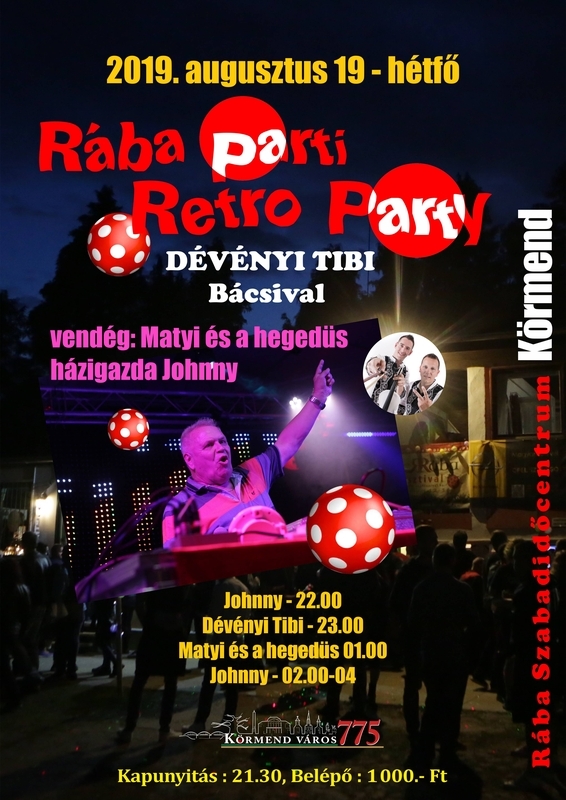 Augusztus 19-én Rába Parti Retro Party - Házigazda Johnny, 22.00 órától, majd 23.00-01.00-ig Dévényi Tibi bácsi hozza legjobb dalait és dobálja pöttyös labdáit, 01-02-ig Matyi és a hegedűs zenél, utána Johnny zárja az estét.
