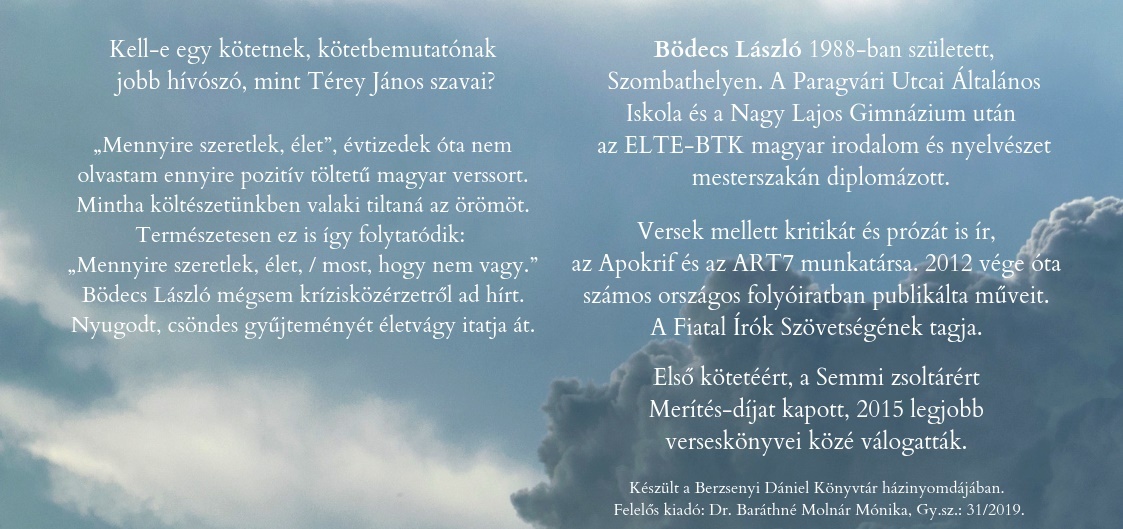 A kötetbemutatón a költő tart felolvasást verseiből. A lírafolyamot Doma Bence zenész és dalszövegíró akusztikus gitáron kíséri. Ezt követően dr. Fűzfa Balázs irodalomtörténész beszélget a szerzővel a kötetről, amelyről így ír Térey János: „Mennyire szeretlek, élet", évtizedek óta nem olvastam ennyire pozitív töltetű magyar verssort. Mintha költészetünkben valaki tiltaná az örömöt. Természetesen ez is így folyatódik: „Mennyire szeretlek, élet, / most, hogy nem vagy." Bödecs László mégsem krízisközérzetről ad hírt. Nyugodt, csöndes gyűjteményét életvágy itatja át.