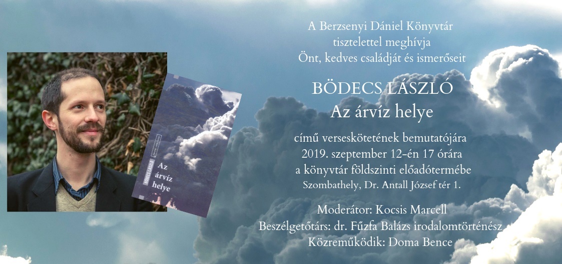 Szeptember 12-én 17 órai kezdettel Bödecs László Az árvíz helye című verseskötetének bemutatójára várják az érdeklődőket a Berzsenyi Dániel Könyvtárban.