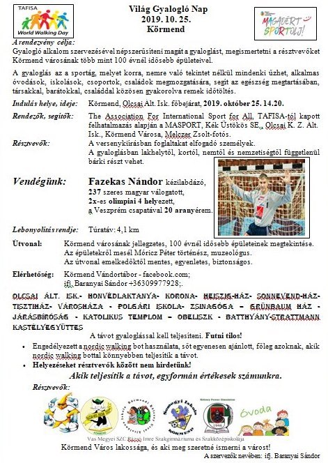 14.20 Gyaloglás Világnapja - 4,1 km táv teljesítése Körmend 100 évnél idősebb épületeinek érintésével. Vendég: Fazekas Nándor válogatott kézilabdázó. Szpíker: Móricz Péter történész - Olcsai-Kiss Zoltán Általános Iskola főbejárat