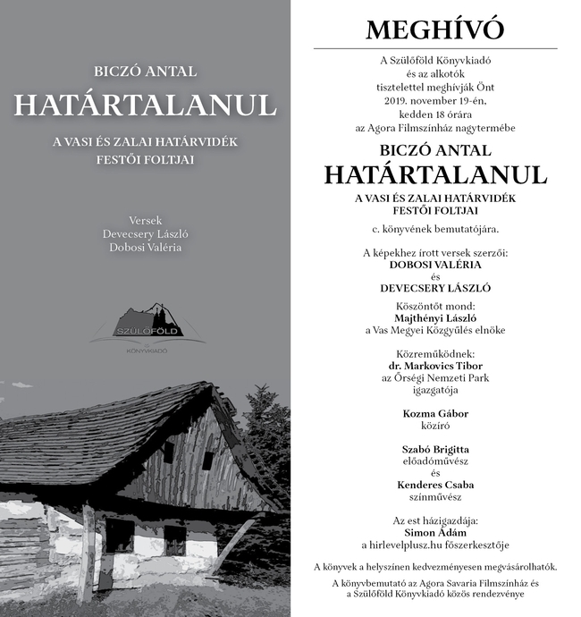 A Szülőföld Könyvkiadó és az alkotók, Biczó Antal Határtalanul - a vasi és zalai határvidék festői foltjai című könyvének bemutatójára várják az érdeklődő közönséget november 19-én (kedden) 18 órára az Agora Savaria Filmszínház nagytermébe.