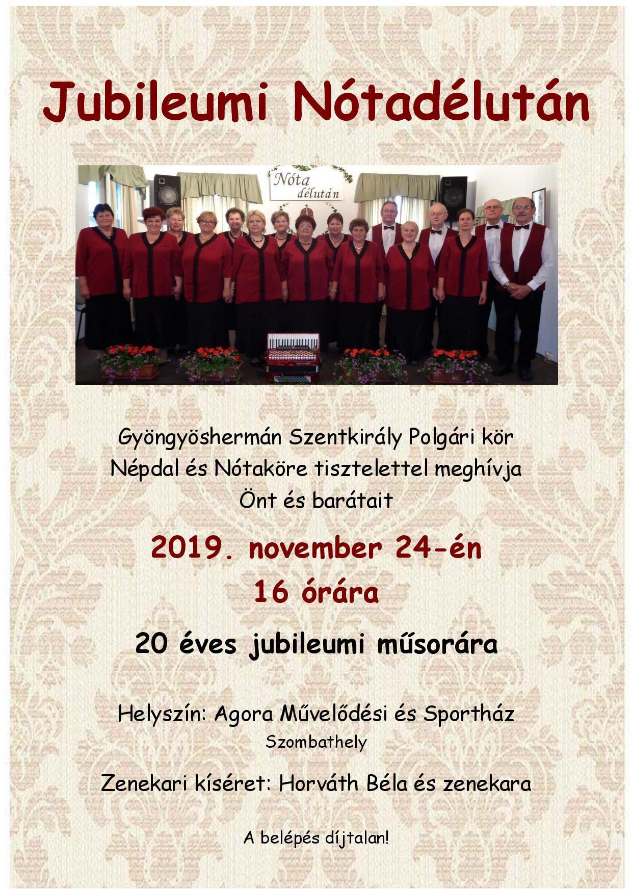 A Gyöngyöshermán-Szentkirályi Nóta és Népdalkör a 20 éves jubileumi nótadélután alkalmával mond köszönetet közönségének, segítőinek, hogy biztatásukkal és támogatásukkal ilyen szép eredményeket értek el a két évtized alatt. A november 24-i előadásra a belépés díjtalan.