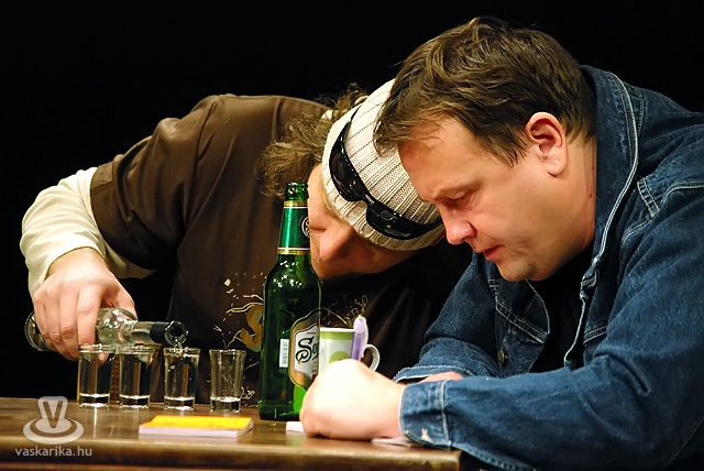 Hasonlóan markáns a két „ősfigura" (Bajomi Nagy György és Orosz Róbert) játéka is, akik már annak idején Horváth Ákossal (Atis szerepében) együtt játszottak a darabban. Orosz Róbert, a meló után a vasúti talponállóban feleseket „vízmértékező" kőműves szerepében a citromba harapott néző arcára is mosolyt varázsolt. Ez a szkeccs szövegében is töményebb, mint a jelenetekben elfogyasztott összmennyiségű pálesz illata. Akit a sors egyszer is összesodort a malteroskanál és a vízmérték mesterével, az a szakmai polémián hasát fogja a röhögéstől. Sanyi mester csak hozta egymás után a dekás poharakat, a pálinkaszag már a nézőtéren is terjengett, de ő pohárról pohárra lovallta bele magát az építkezési utóparába. Pálinkával mindent meg lehet oldani, minden ügyet el lehet simítani. Még a falat is. Ismerős?