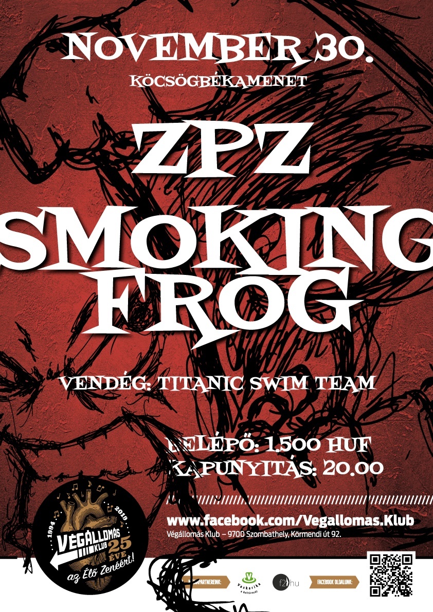 Két remek rockbanda teszi tiszteletét a Végállomásba. Színpadra lép Magyarország egyetlen köcsögmetált játszó bandája, a nem kevés helyi kötődéssel bíró ZPZ, valamint a 3. születésnapját ünneplő, szintén helyi Smoking Frog. A hangulat izzításáról pedig a celldömölki Titanic Swim Team gondoskodik.