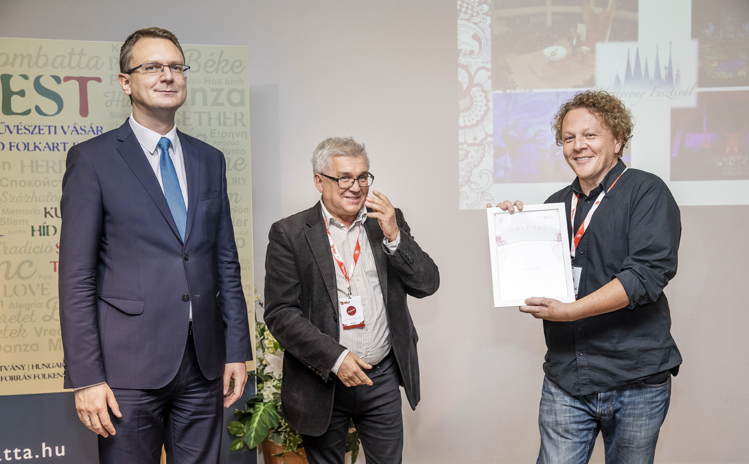A Fesztiválszövetség elismerésével Horváth László, a Fonó igazgatója, Rétvári Bence és Márta István társaságában (fotó forrása: Magyar Fesztiválszövetség)